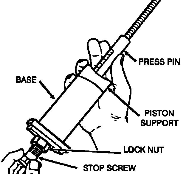1. Thread the stop screw and lock nut assembly into the base. Fit the correct piston support on top of the base. Insert the press pin, threaded end up, into the hole in the piston support until its end touches the stop screw. See Figure 5.