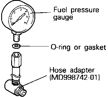 3. Using the fuel pressure gauge adapter (MD998742-01) or equivalent, install the fuel-pressure gauge to the delivery pipe (fuel rail).