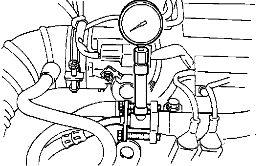 9. Stop the engine and check for a change in fuel pressure readings. Pressure should hold for 5 minutes. If the gauge reading drops, observe the rate of drop. Determine the cause according to the following symptoms.