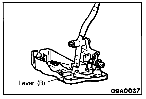 3. Adjust, by using the adjuster, so that the end of the select cable is positioned as shown in the illustration relative to lever (B).