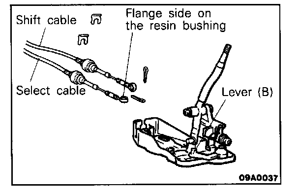 4. The flange side of the resin bushing at the select cable end should be at the lever (B) end surface.