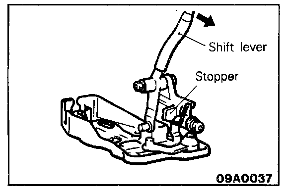 2. Move the shift lever (at the vehicle interior side) downward, in the direction (4th gear position) shown in the illustration until it contacts the stopper.