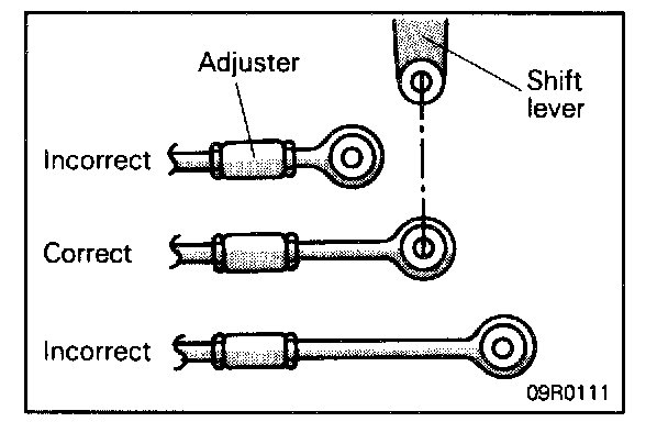 3. Adjust, by using the adjuster, so that the end of the shift cable is positioned as shown in the illustration relative to the shift lever (interior side).