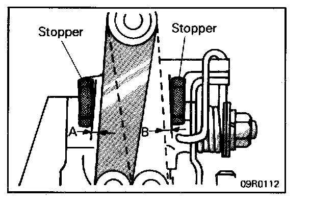 5. Adjust the length of the shift cable, by using the adjuster, so that the clearance (A) and (B) between the shift lever and the two stoppers are equal when the shift lever is shifted to 3rd gear and 4th gear.