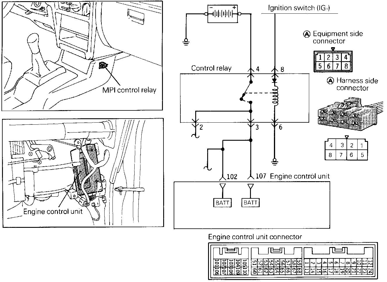 ^ When the ignition switch is turned on, current flows from the ignition switch through the control relay coil to ground. This turns on the control relay switch and power is supplied from the battery through the control relay switch to the engine control unit.
