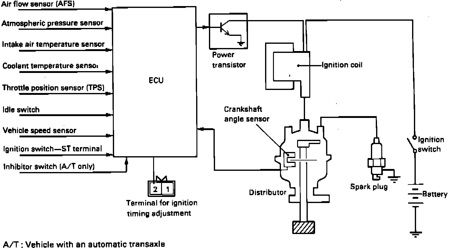 The Ignition Timing Control System operates by the ECU controlling the ignition timing through the power transistor. The ECU uses various sensors (during normal driving conditions) to compute the correct spark advance or retard (during engine cranking, the ignition timing is fixed at 5°BTDC). The ECU uses the power transistor to control the ignition spark.