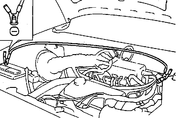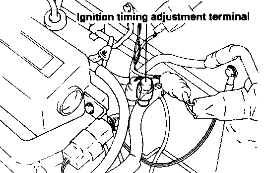 2. With the engine stopped, connect a lead wire, between the terminal for ignition timing adjustment (located in the engine compartment) and ground.