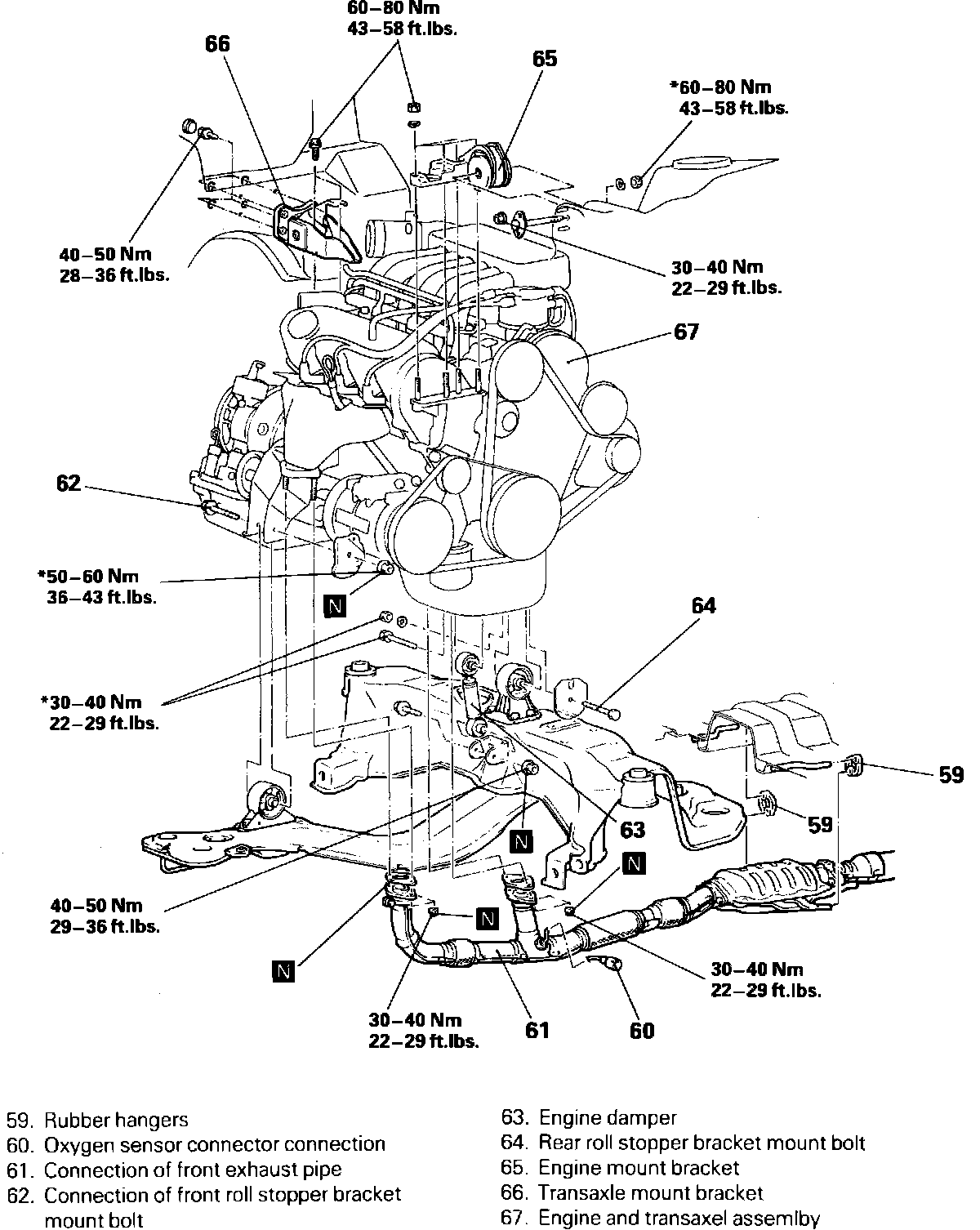 d. On models with manual transaxle, tighten transaxle to engine bolts to specifications.