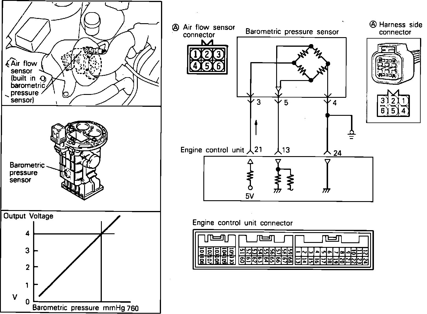 The Barometric Pressure Sensor, located in the Air Flow Sensor (AFS), senses the atmospheric pressure and converts it into a voltage which is sent to the ECU. The ECU uses this signal to compute the altitude at which the vehicle is running, accordingly correcting the air-fuel ratio and the ignition timing, thus improving driveability at high altitude.