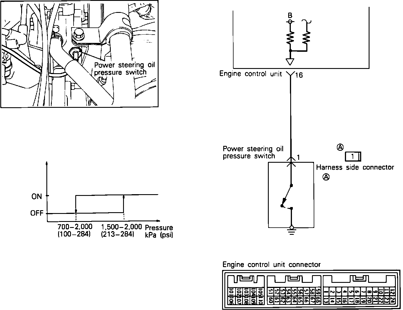 The P/S load switch, located on the P/S pump, is used to provide a signal to the ECU when there is steering load. The ECU uses this information for idle speed control. When pump output pressure exceeds a preset level, the switch closes, completing the circuit to ground.