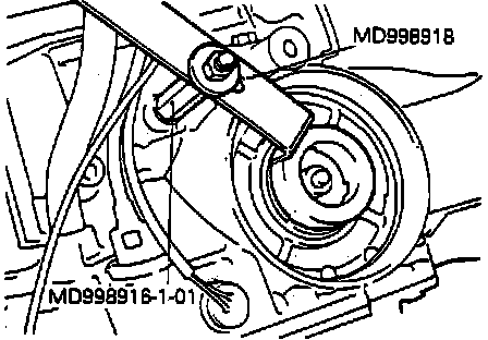 4. To prevent rotation of piston, engage pawl of kickdown servo wrench tool No. MD998918, or equivalent into notch of piston and attach wrench using adapter tool No. MD998916-1-01, or equivalent, Fig. 5. Do not press in piston with special tool. When mounting adapter on transaxle case, tighten by hand only. Do not over torque.