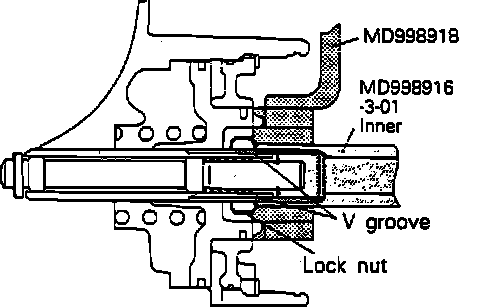 5. Loosen locknut to before the V groove of adjusting rod and tighten kickdown adjusting inner tool No. MD998916-3-01, or equivalent until it contacts locknut, Fig. 6.