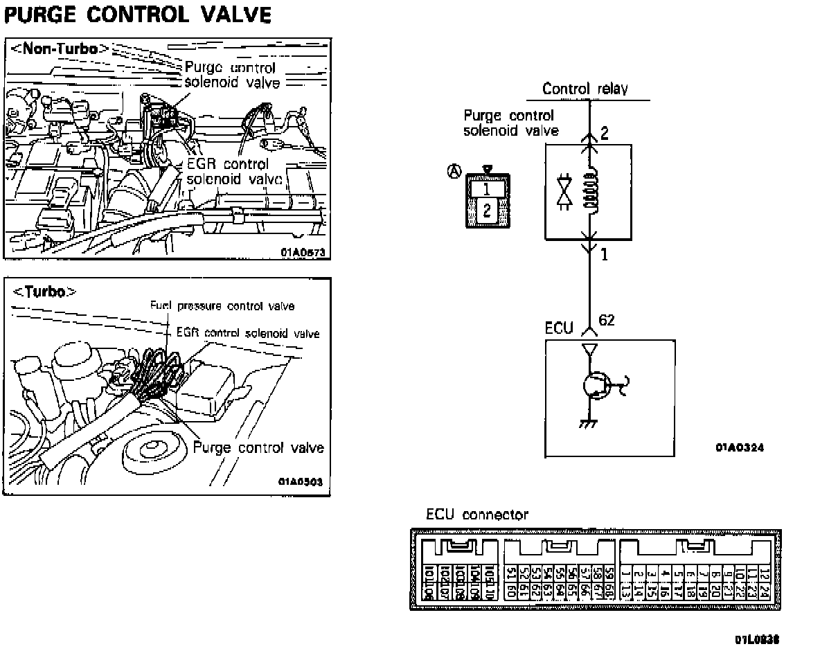 The purge control solenoid valve is the ON/OFF control type of solenoid valve; it functions to control the activation of the purge-control valve.
