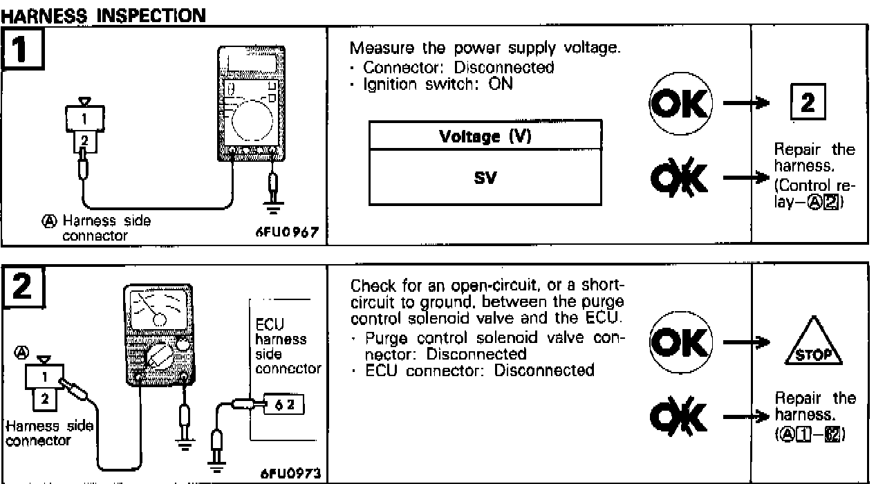 The purge control solenoid valve is the ON/OFF control type of solenoid valve; it functions to control the introduction of purge air to the intake air plenum from the canister.