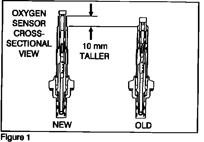 This new oxygen sensor uses a ceramic type insulating material which withstands a higher temperature. This makes the new sensor 10 mm longer than the one being removed (Figure 1).