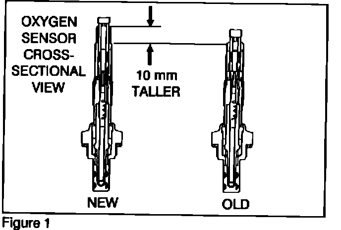 This new oxygen sensor uses a ceramic type insulating material which withstands a higher temperature. This makes the new sensor 10 mm longer than the one being removed (Figure 1).