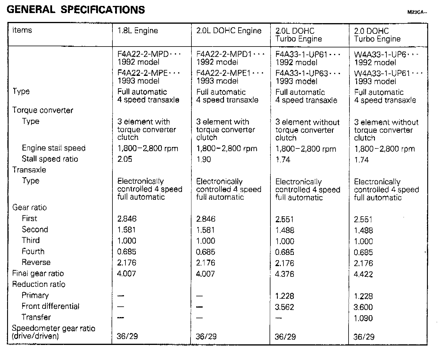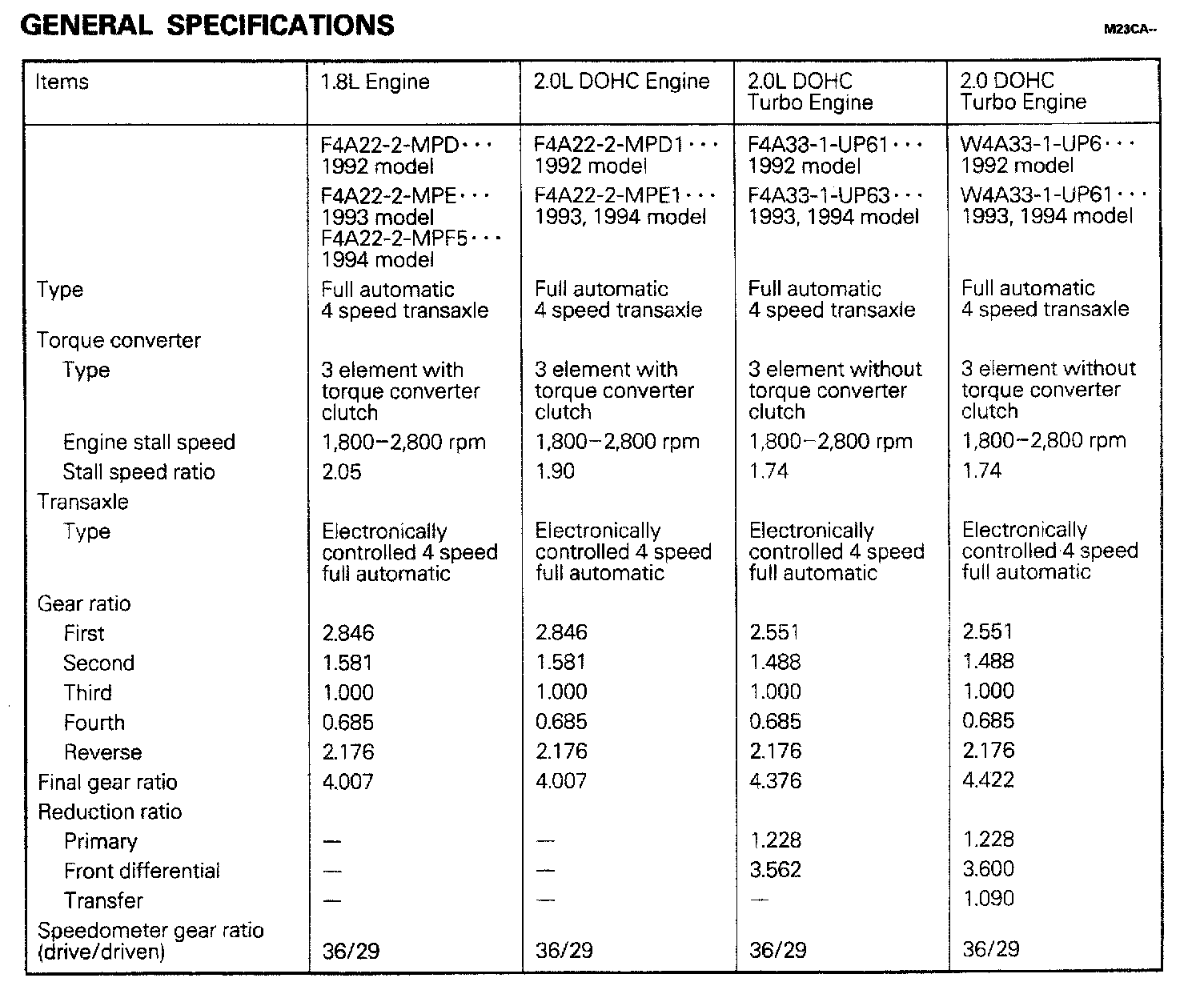 F4A22/F4A33/W4A33 4-spd A/T, Gear Ratios Cont. ('94):