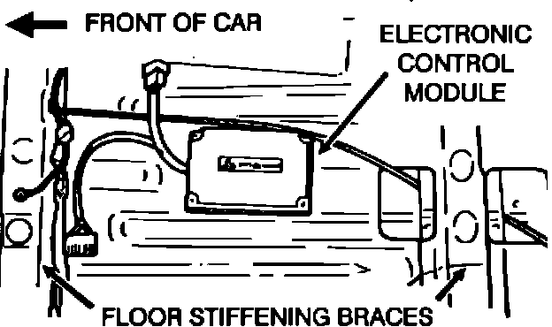 1. Lift the carpet. Using carburetor spray cleaner or equivalent, clean the center floor area under the driver's seat. Using the double sided tape supplied, mount the Electronic Control Module (ECM) in the flat valley between floor stiffening braces (Figure 10).
