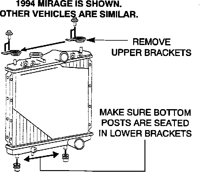 2. Remove the upper radiator mounting brackets. Check the radiator to ensure its two bottom mounting posts are seated in the lower mounting brackets.