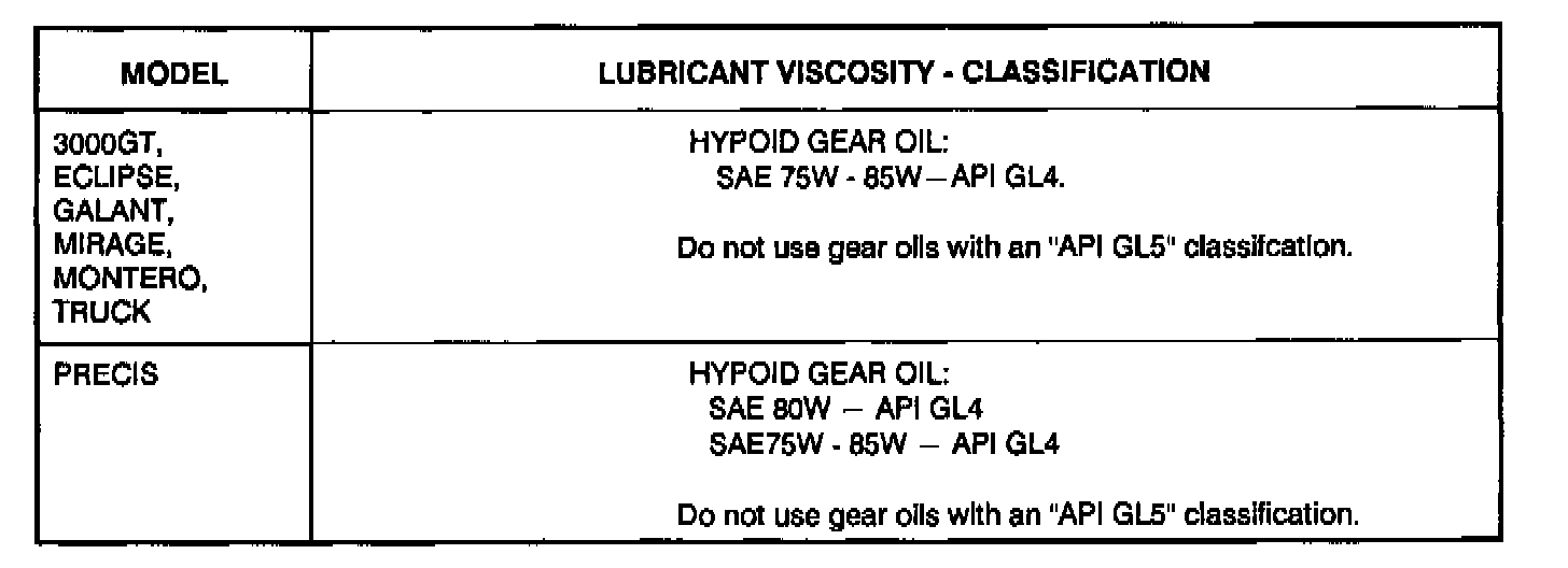 The manual transmissions/transaxles in 1991 Mitsubishi Motors vehicles require the use of certain gear oil viscosities and classifications. This bulletin supersedes gear oil specifications shown in 1991 service manuals. Using gear oil of the wrong viscosity and/or API Classification will affect the shift effort (particularly at low ambient temperatures) and may cause transmission component damage.
