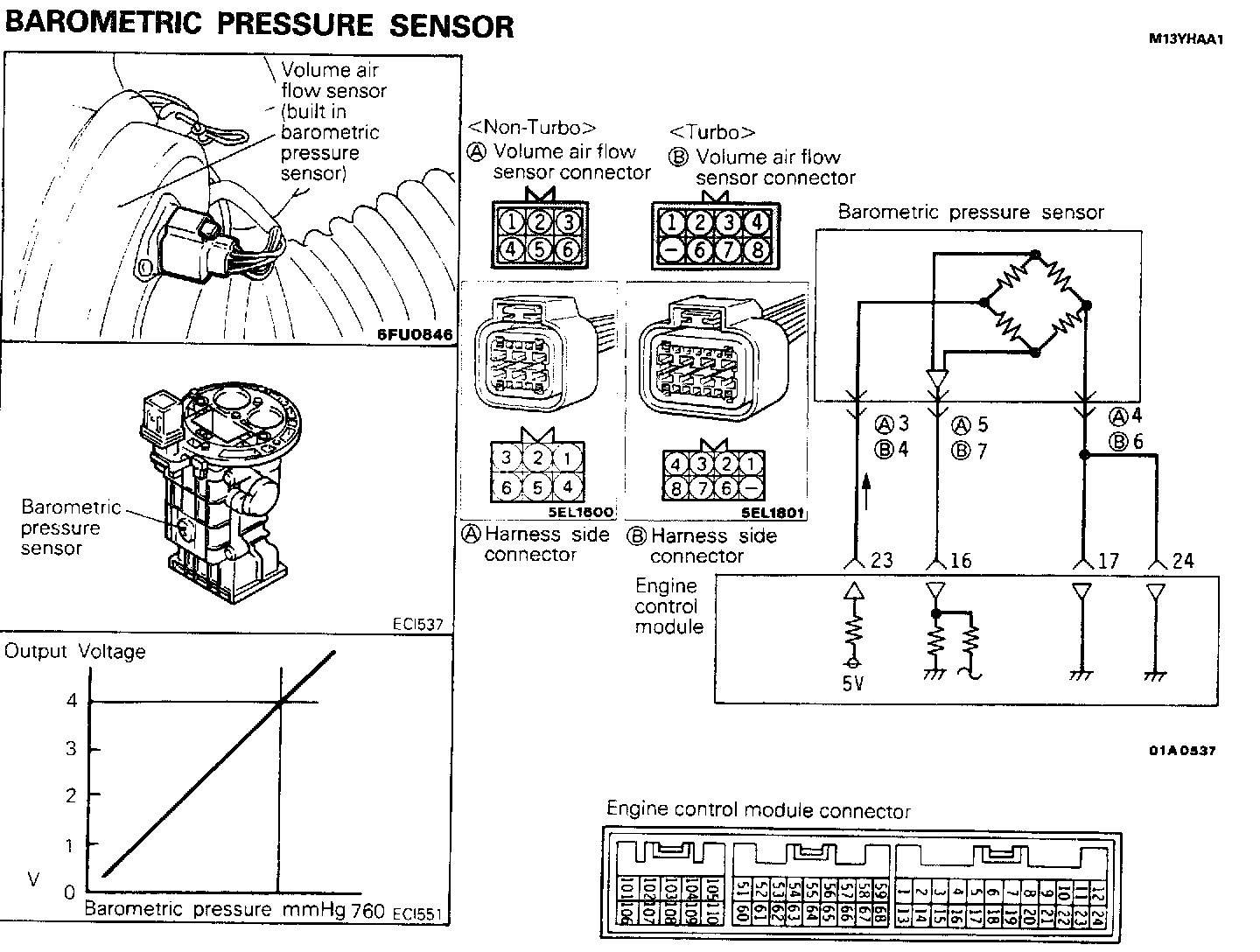 The barometric-pressure sensor output Voltage is sent to the engine control module in proportion to the barometric pressure (absolute pressure).