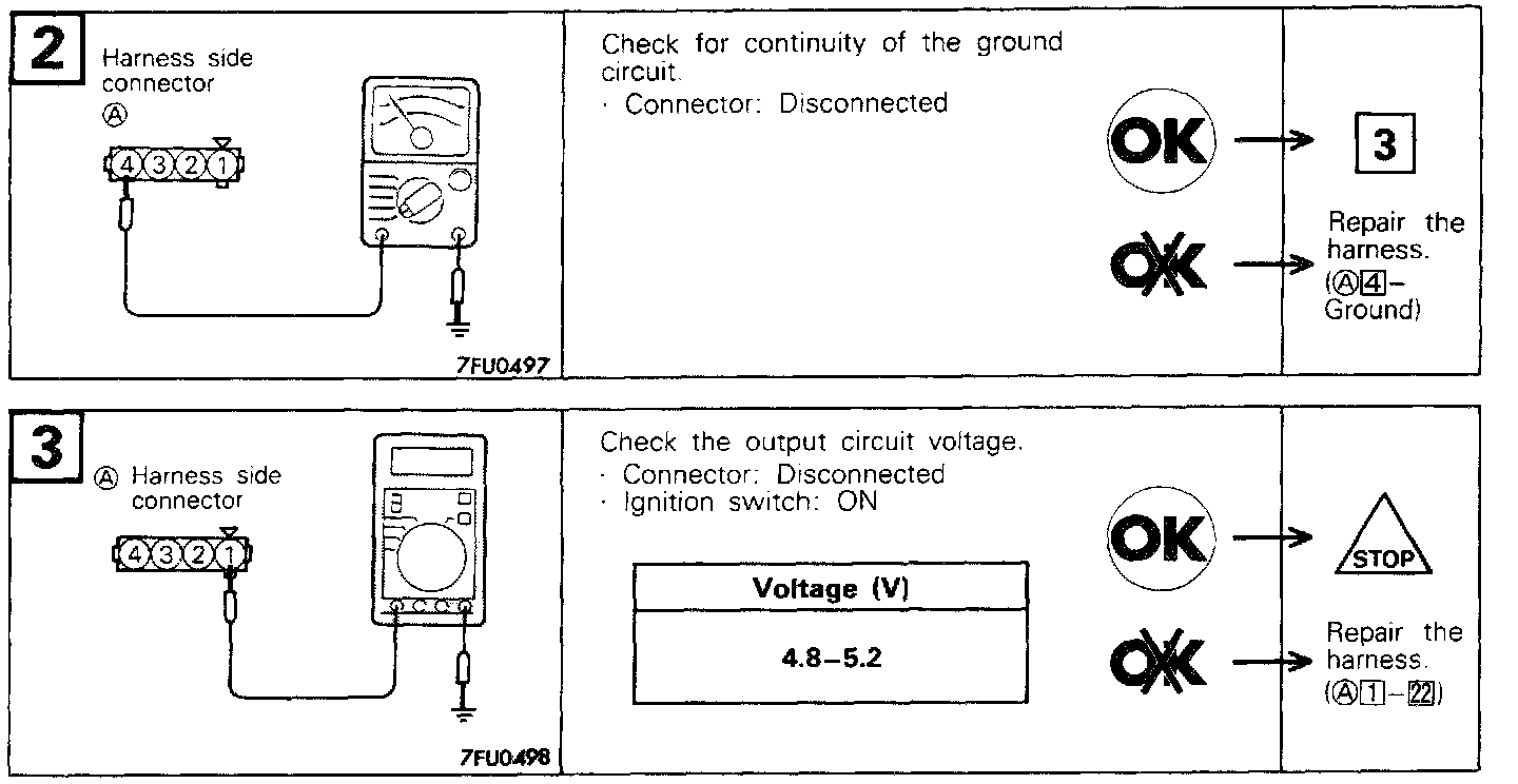 The power for the camshaft position sensor is supplied from the multiport fuel injection relay and is grounded to the vehicle body. The camshaft position sensor, by intermitting the flow (to ground) of the 5V Voltage applied from the engine control module produces pulse signals.