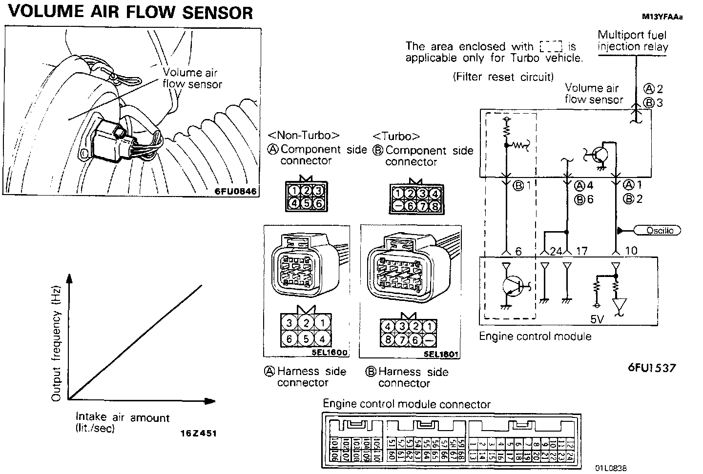 The volume air flow sensor is incorporated within the air cleaner; it functions to convert the amount of engine air intake to pulse signals of a frequency proportional to the amount of engine air intake, and to input those/signals to the engine control module. The engine control module then, based upon those signals, calculates the amount of fuel injection, etc.