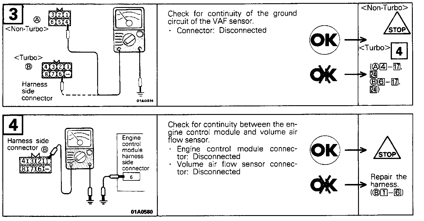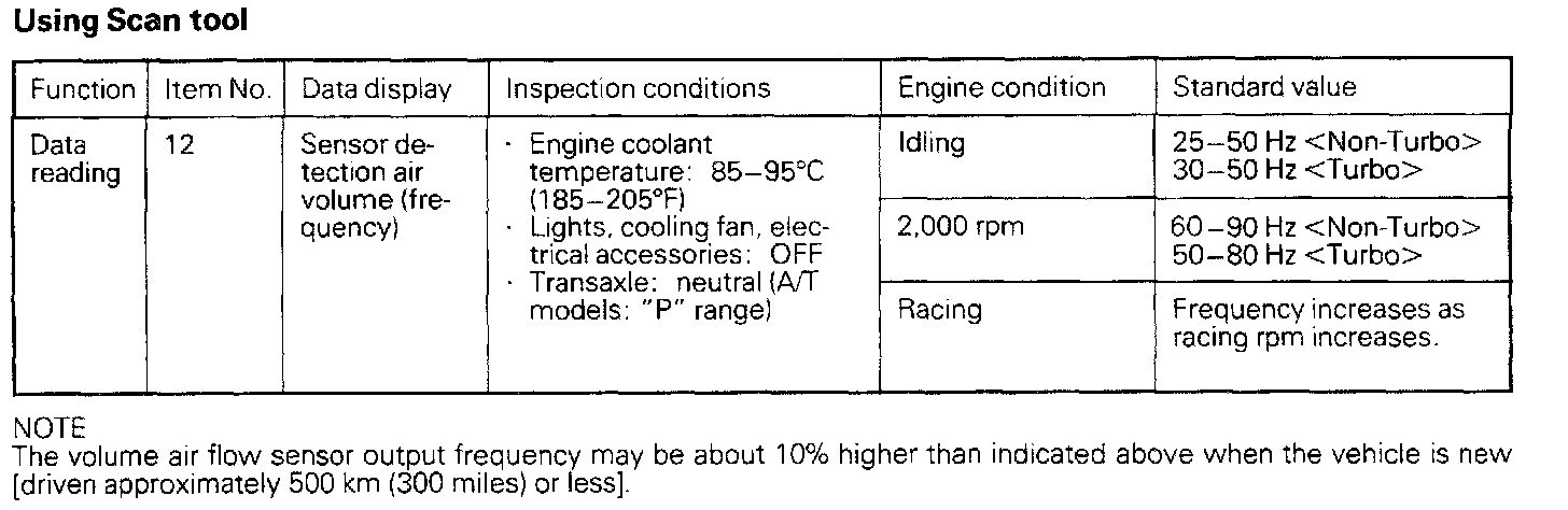 Hint 3: If idling is possible even though the volume air flow sensor output frequency is deviated from the standard value, the cause is usually a malfunction other than of the volume air flow sensor.