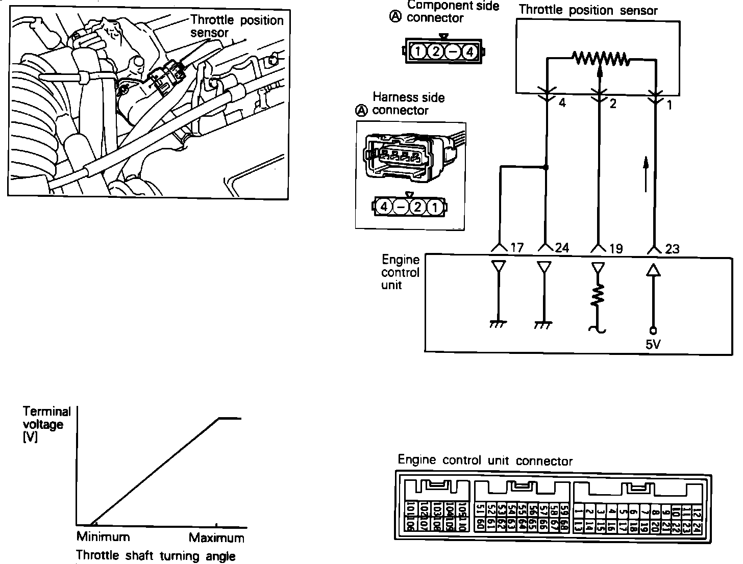 As the throttle shaft rotates, the output Voltage of the TPS changes. The ECU determines the throttle valve opening based on the output Voltage. The ECU computes throttle valve opening change (output Voltage change) and judges the engine acceleration state and accordingly corrects fuel injection amount during acceleration.