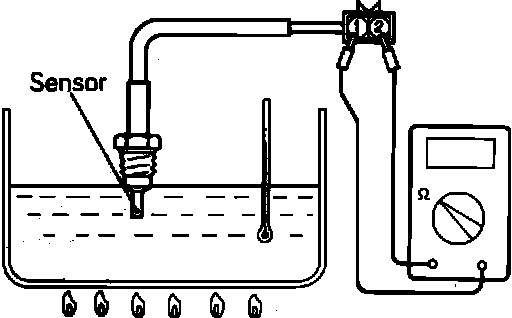 3. Heat the water to 50 degrees C or 122 degrees F. Verify that the resistance of the sensor falls between 60 and 83k Ohms.