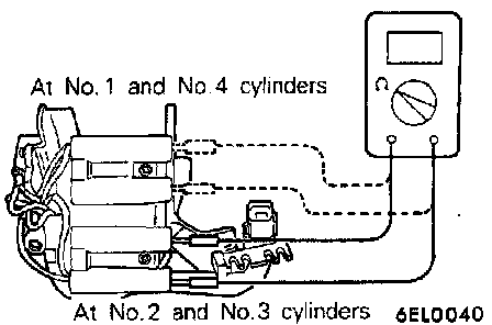 (4) Measure the resistance between the high-Voltage terminals for the No. 1 and No.4 cylinders, and between the high-Voltage terminals for the No.2 and No.3 cylinders.