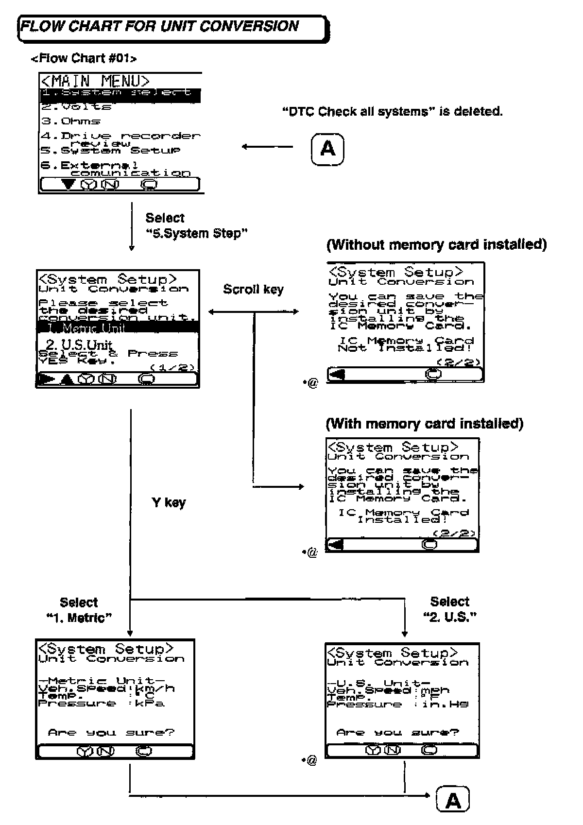 The flow from "Main Menu" to "System Select" screen is modified. Also, the "All DTC Check system" selection is deleted.