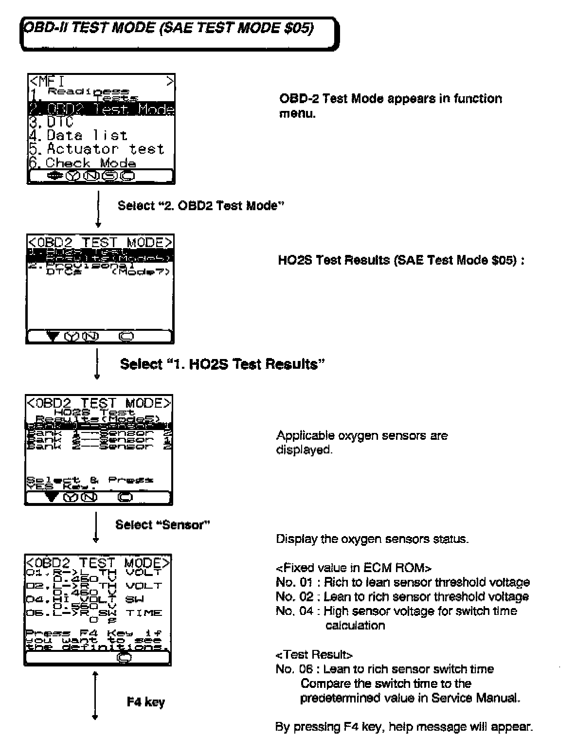 After selecting "HO2S Test Results (Mode 5)" in OBD-II Test Mode, this message is displayed by pressing the F4 Key.