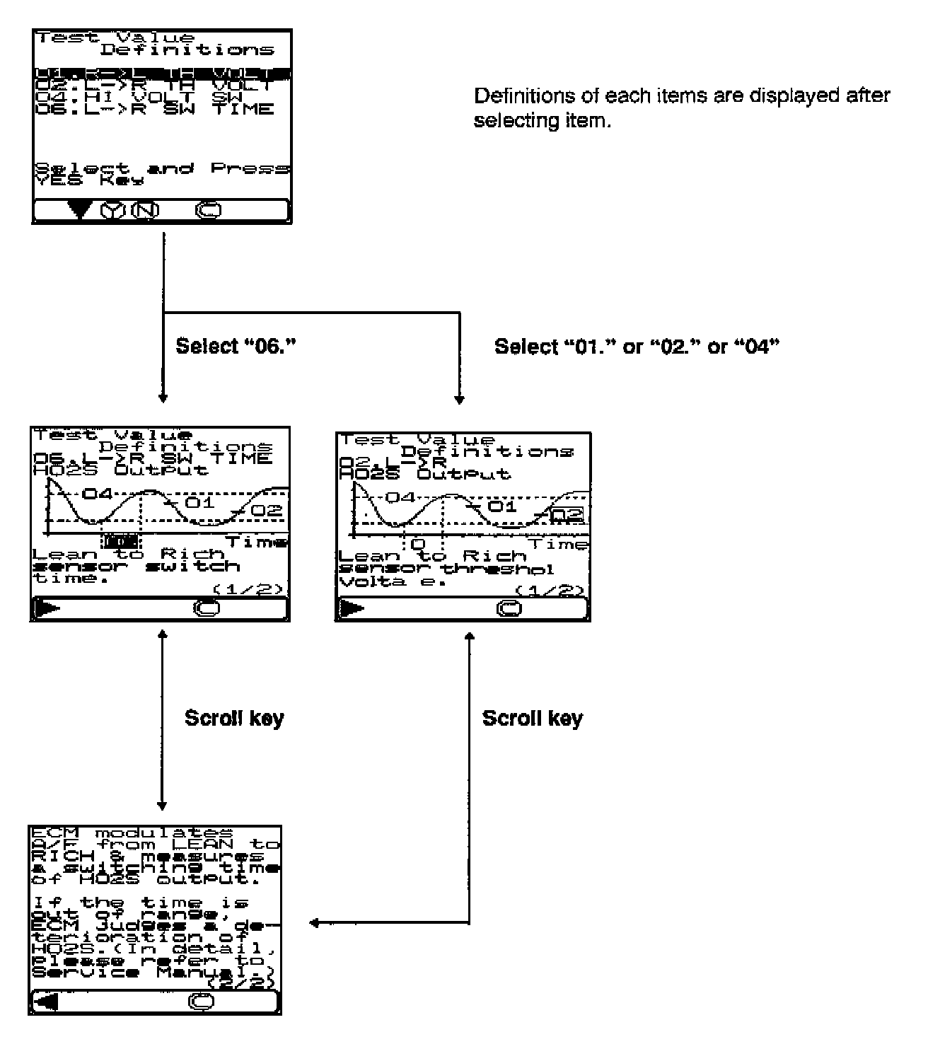 Items No. 01, 02, and 04 are fixed values in the ECM ROM. Item No. 06 is the test result. If this value is over the predetermined value, the technician knows that a problem has occurred. If this value is within the predetermined value, the malfunction is a open or short circuit. Items No. 04 and 06 are not available for H02S Sensor 2 because the ECM does not use HO2S Sensor 2 to detect its deterioration.