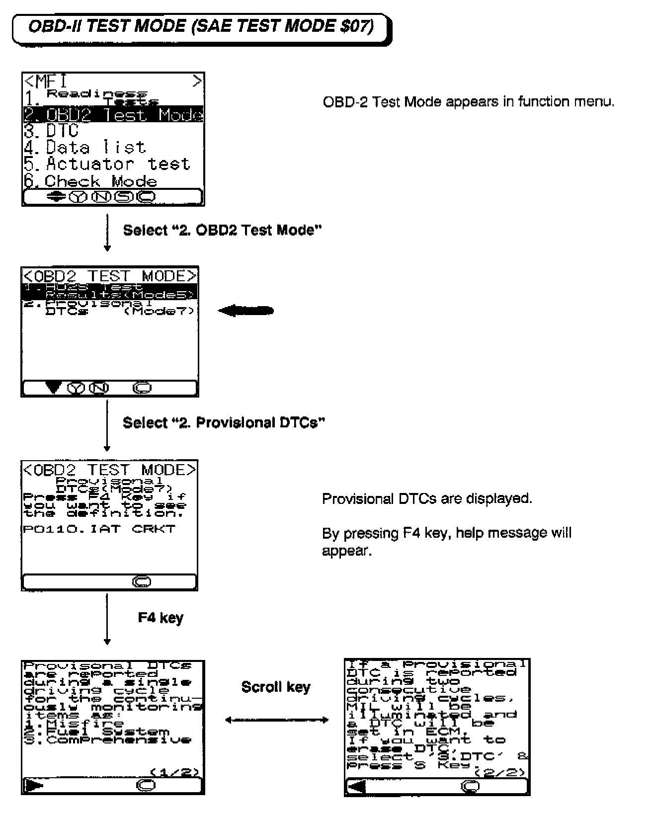After selecting "Provisional DTCs (Mode 7)" in OBD-II Test Mode, this message is displayed by pressing the F4 Key at the DTC display screen when a DTC appears. Refer to the flowchart for the MUT-II selection sequence for obtaining provisional DTCs.