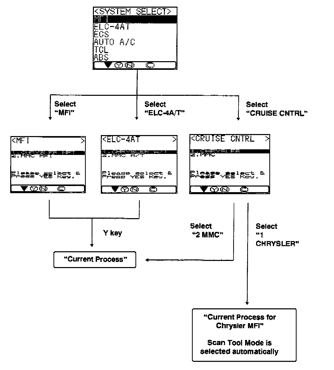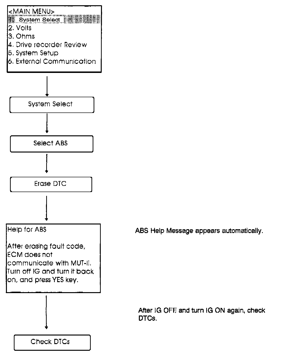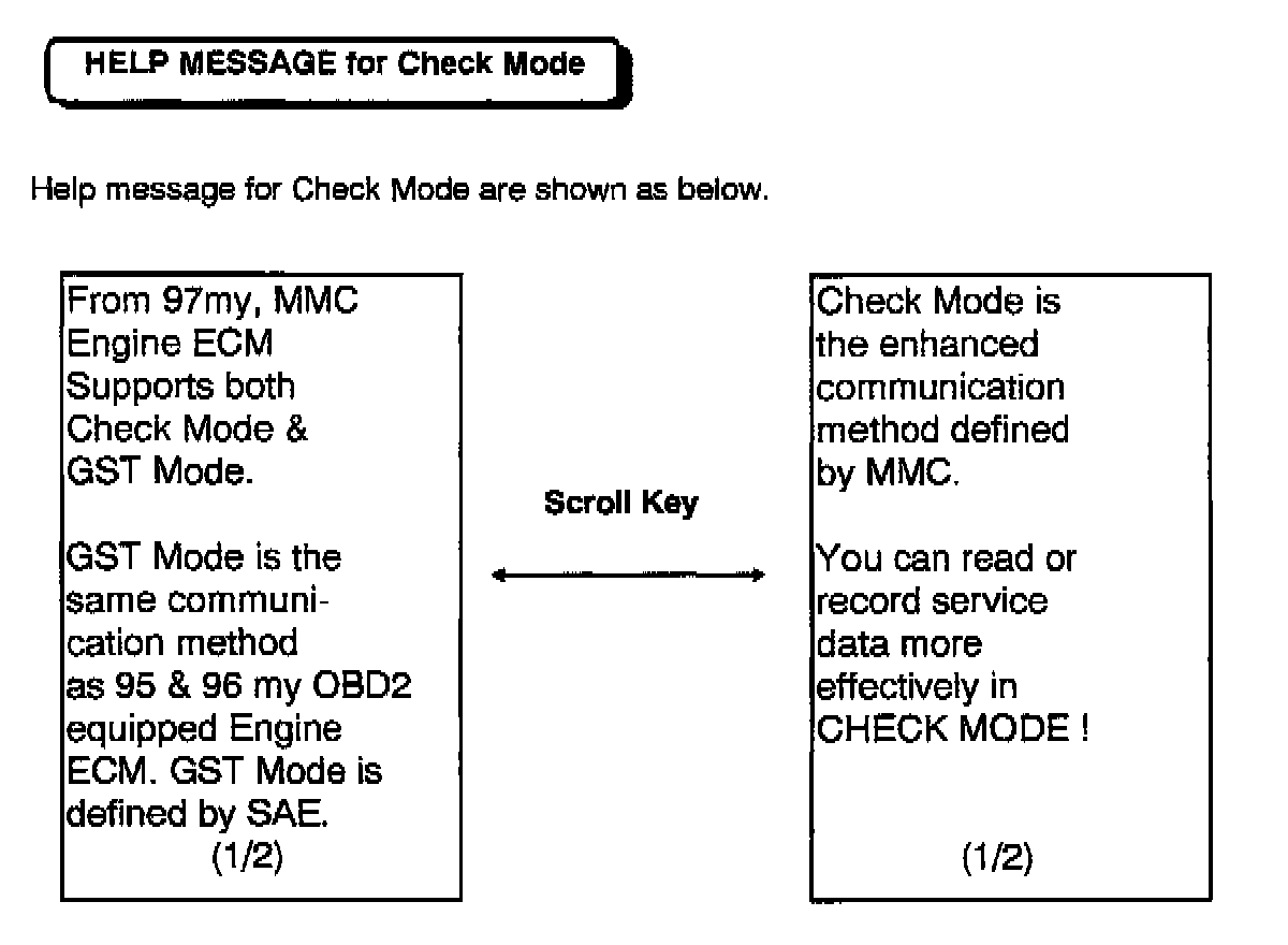 If the ECM is "dual" type, "Check Mode" will display in the menu. "Check Mode" uses the ISO9141 MMC Standard communication method when communicating with the ECM. The MUT-II can read and record service data more precisely and effectively when using "Check Mode."