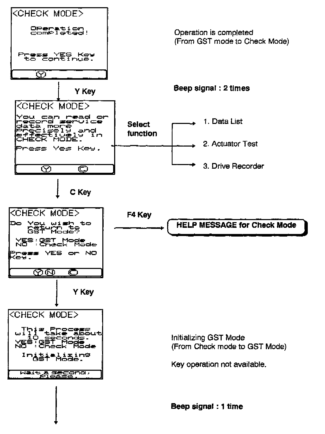 This message can be displayed by pressing the F4 Key at the "CHECK MODE" screen after selecting it from the Function menu. This message is also displayed automatically when returning from "CHECK MODE" to "GST MODE."