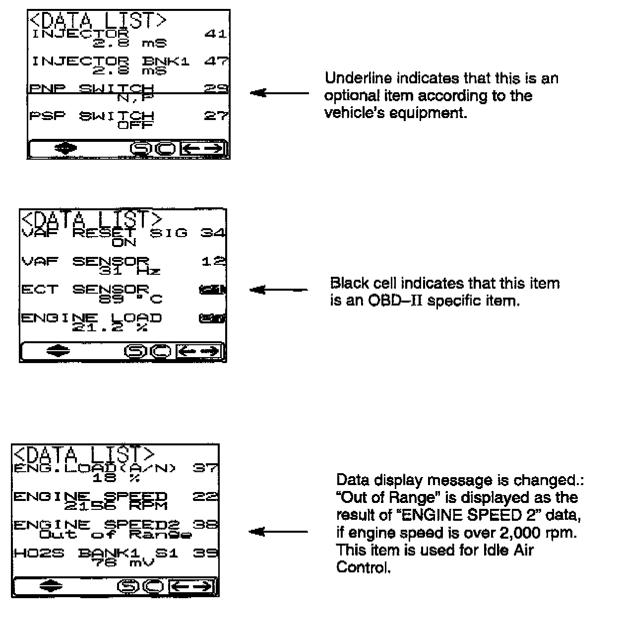 With the new ROM pack, the MUT-II displays OBD-II and Mitsubishi original service data items separately. Item names are sorted alphabetically. OBD-II item numbers are displayed on a black background.