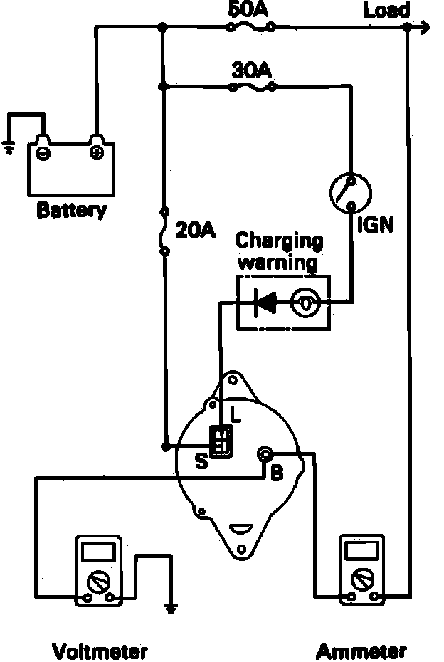 b. Connect a digital voltmeter between alternator ``B'' terminal and ground. Connect the positive lead wire of the voltmeter to the alternator ``B'' terminal and the negative lead wire to ground Fig. 3.