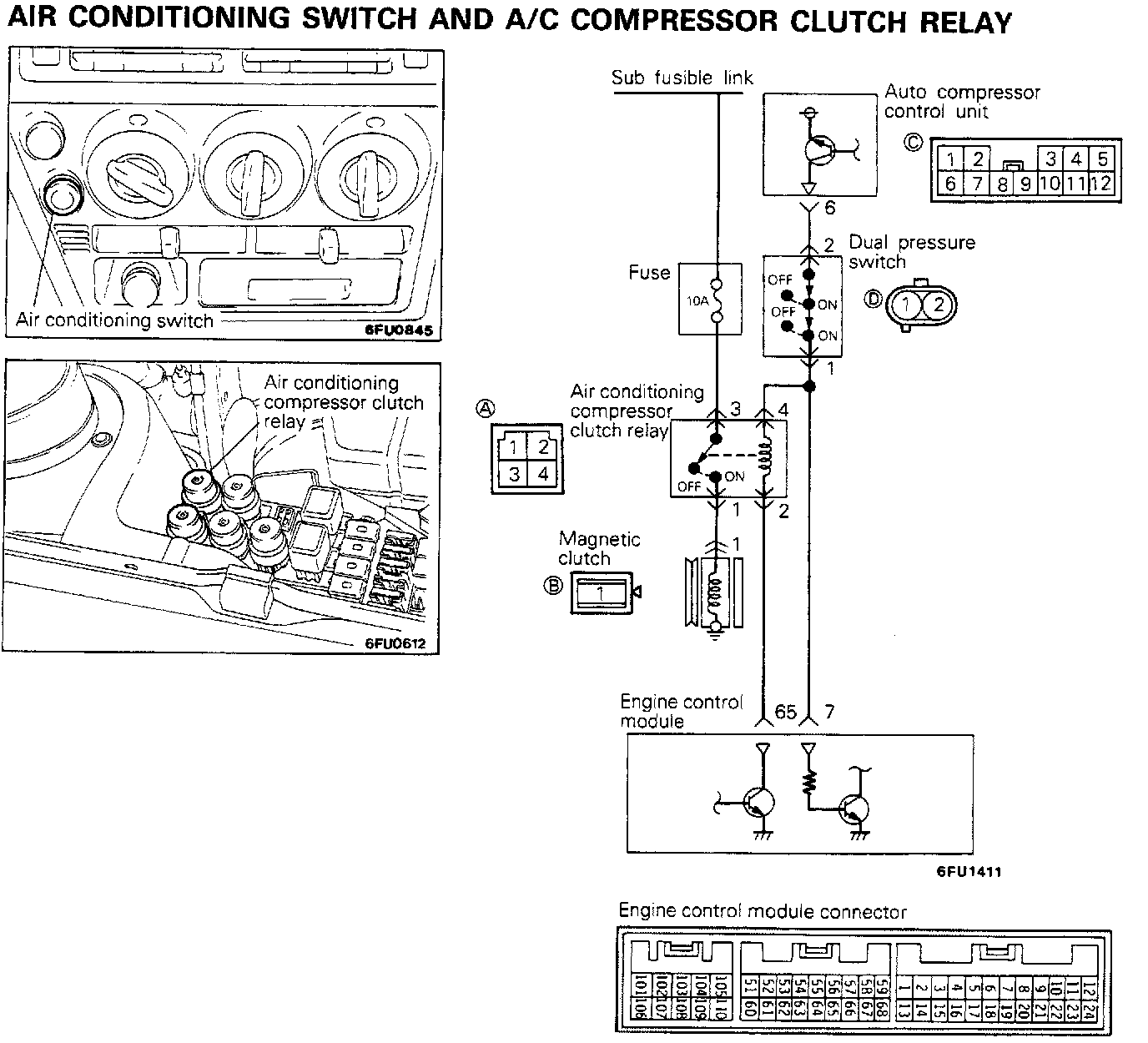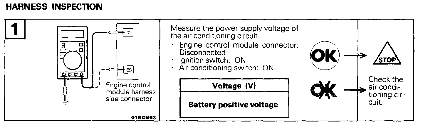 If the air conditioning compressor's magnetic clutch is not activated when the air conditioning switch is switched ON during idling, it is probable that the cause is a malfunction of the air conditioning control system.