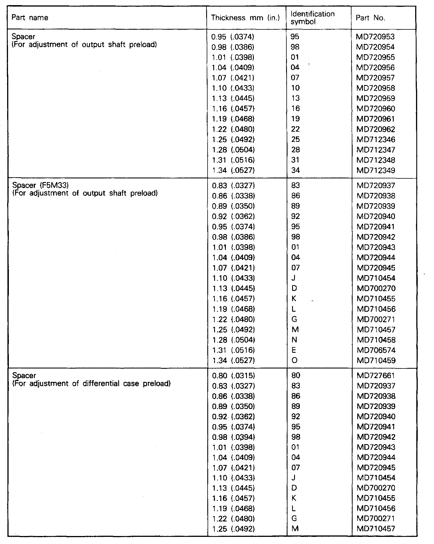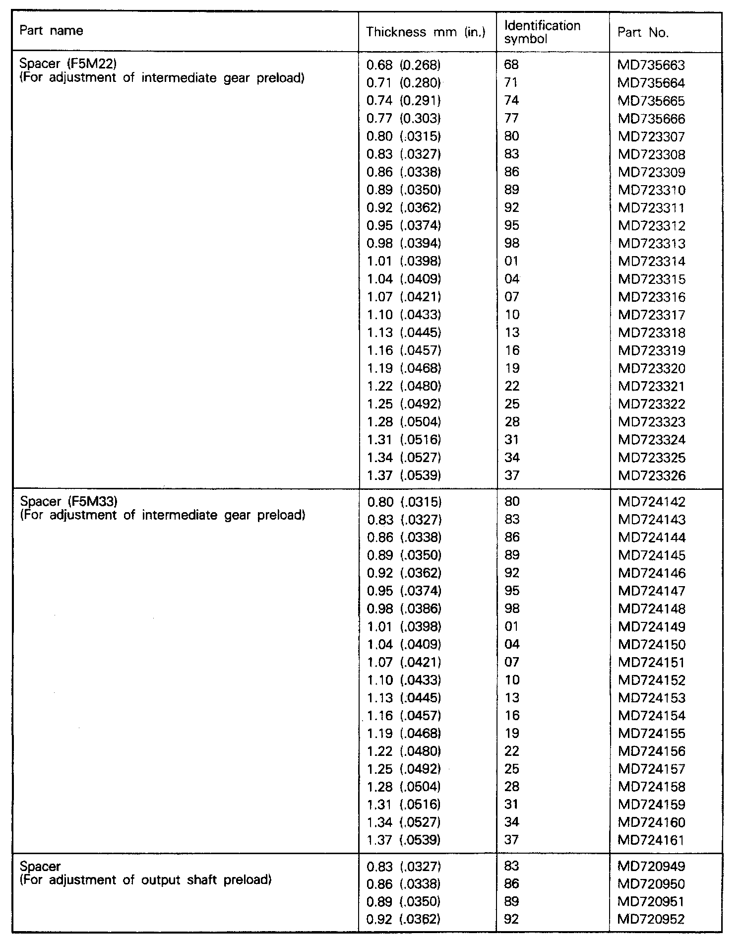 F5M22/F5M33 5-spd M/T, Output Shaft & Differential Preloads: