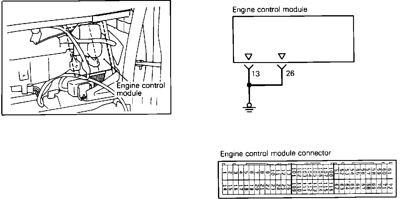 1. Using an ohm meter, check for continuity between ground and ECM harness terminals 13 and 26.