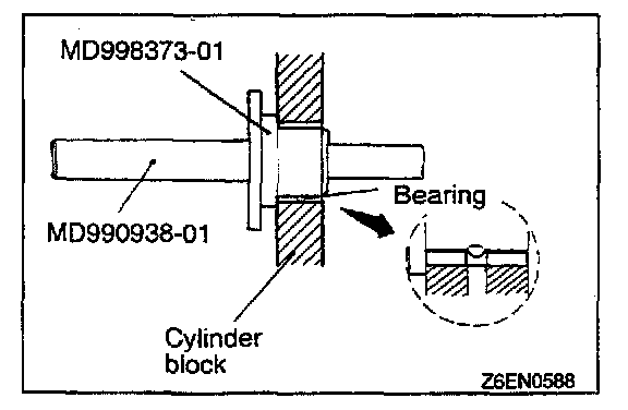 2. Using special tools, install the right rear bearing. Make sure that the oil hole of the bearing is aligned with the oil hole of the cylinder block.