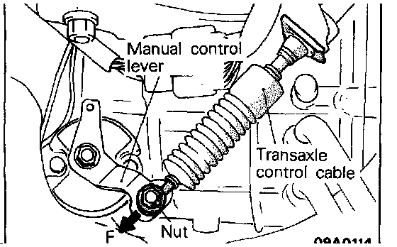 5. Loosen the nut shown in the figure, and lightly pull the end of the transaxle control cable in the "F" direction by hand.