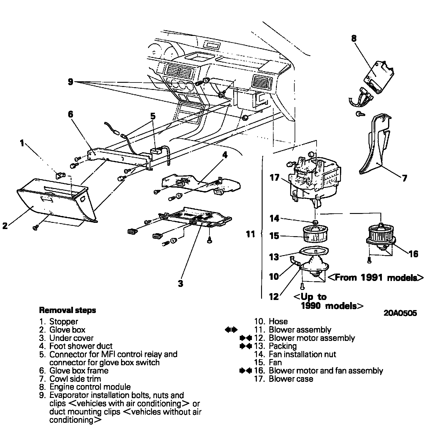With the evaporator pulled outward (to the cabin side), remove the blower assembly (vehicles with air conditioning).