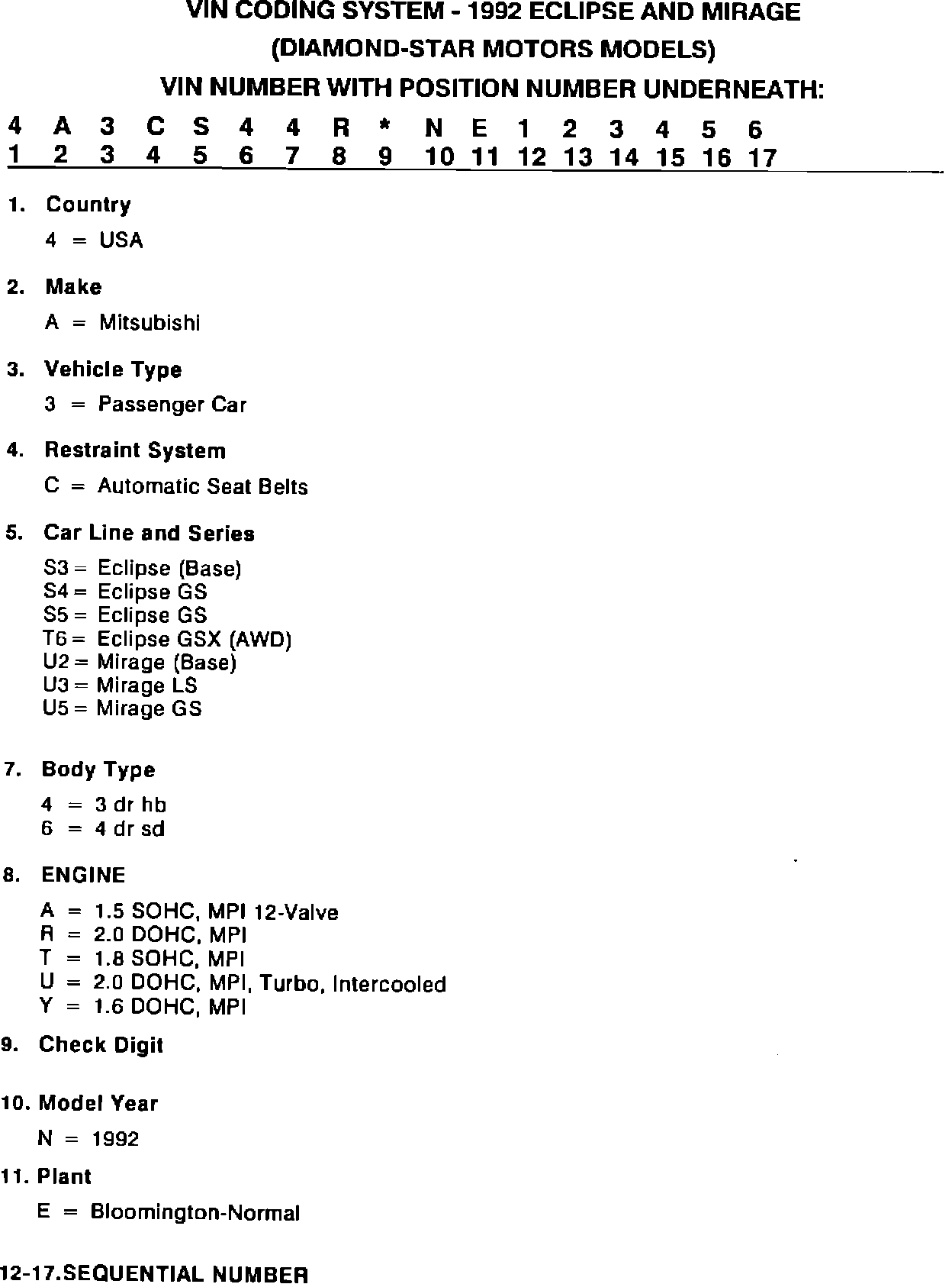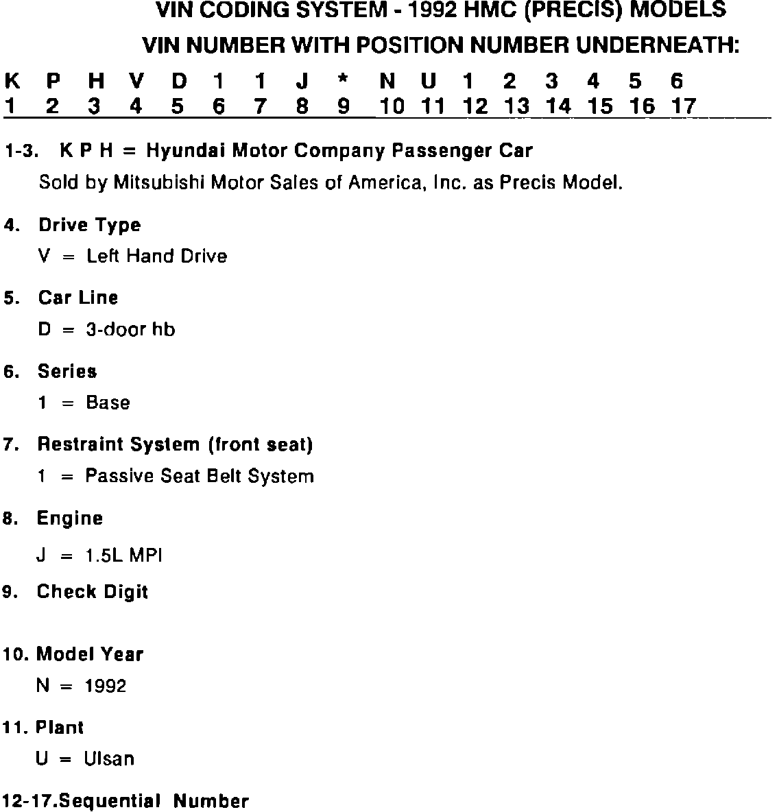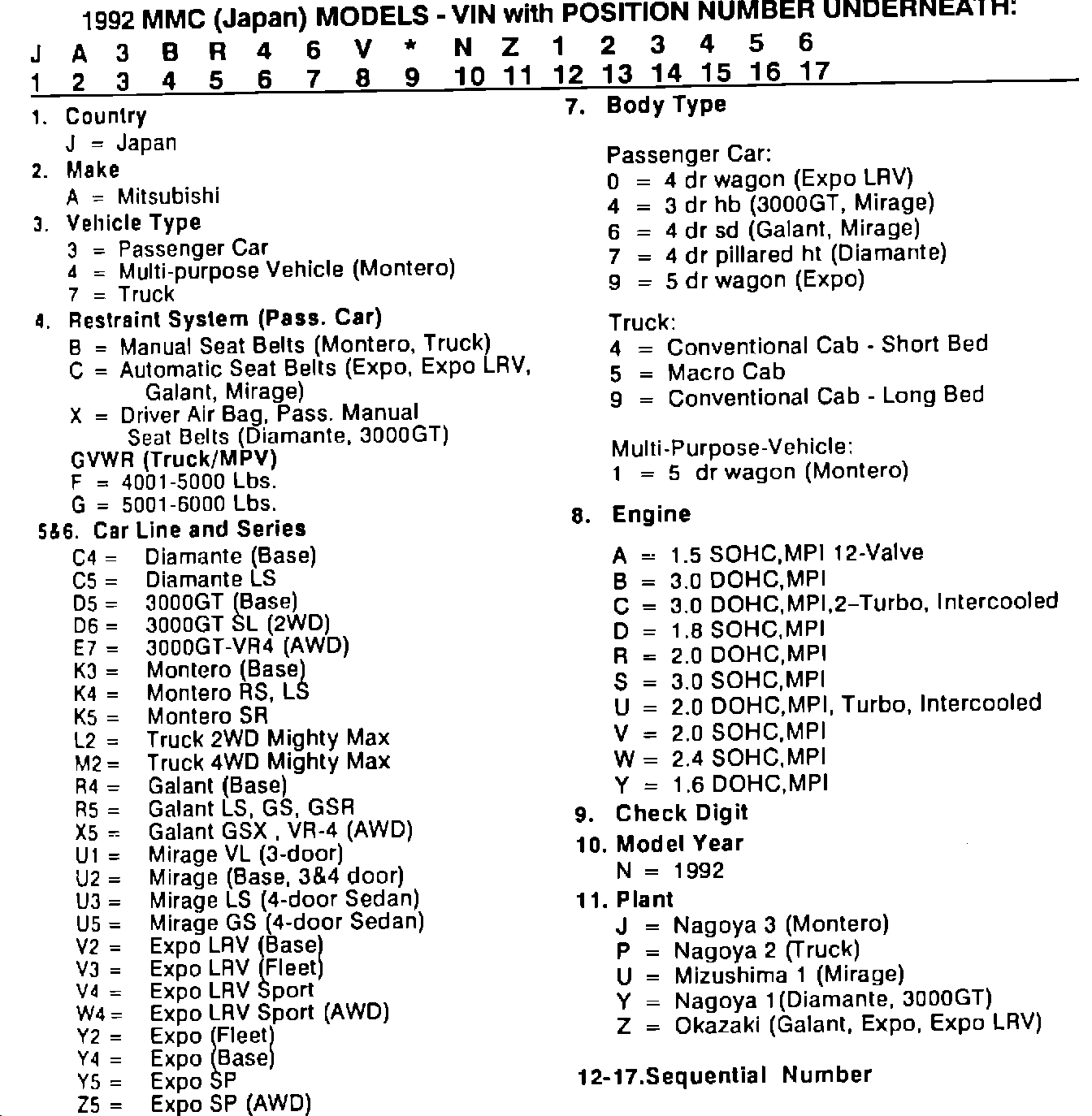 This bulletin contains information to decode the Vehicle Identification Number on all 1992 MMSA cars and trucks. The information is presented in 3 sections. MMC Japan models; Diamond-Star Motors cars and HMC (Precis) models.