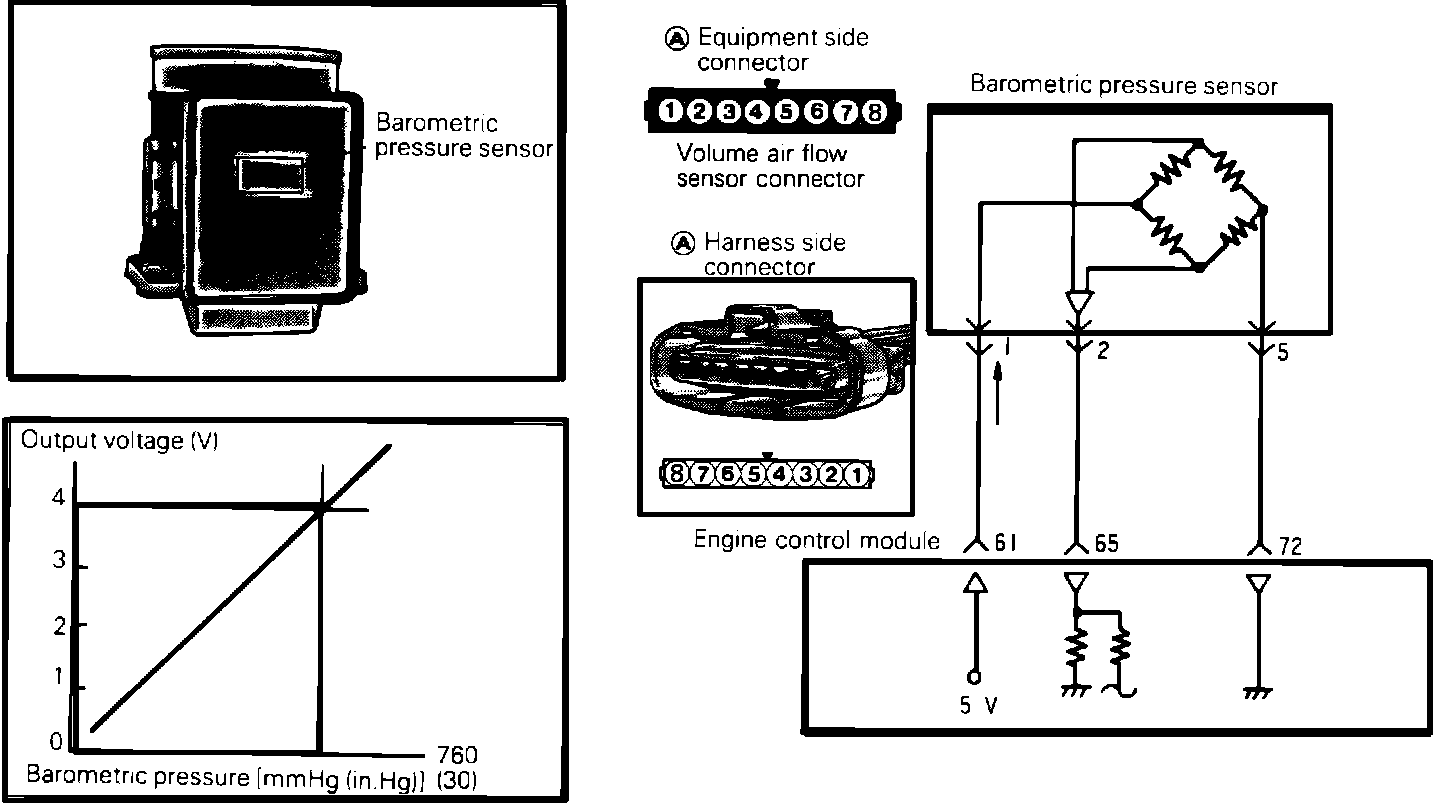 To test the Barometric Pressure Sensor, located on the air flow sensor, in the air cleaner housing, proceed as follows.
