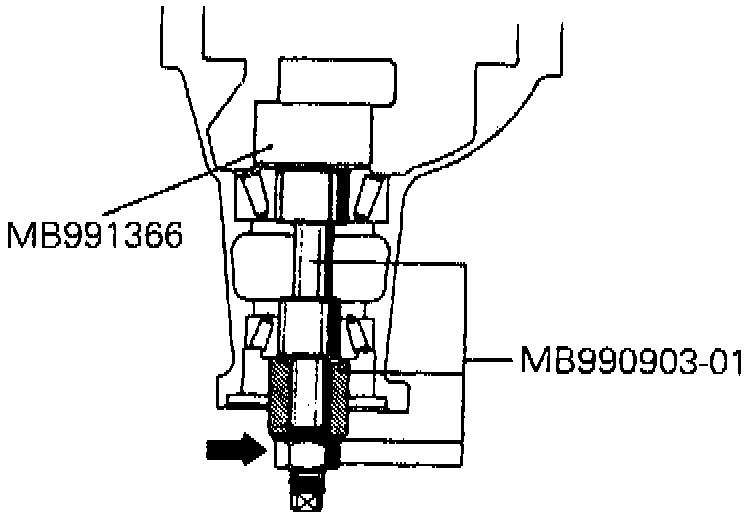 d. Position gauge tube tool No. MB990392-01, or equivalent, in side bearing seat of gear carrier, then select a drive pinion rear shim of thickness which corresponds to gap between special tools.