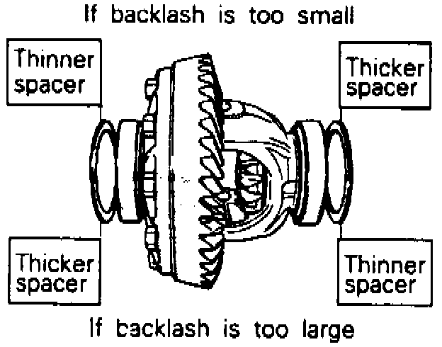 d. If differential gear backlash exceeds 0.008 inch, adjust backlash by installing thicker side gear spacers.