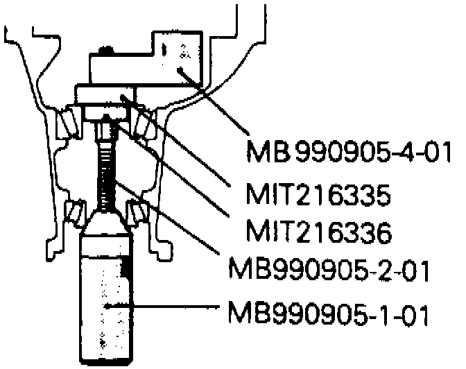 2. Press fit drive pinion rear and front bearing outer races onto gear carrier using handle tool and bearing and oil seal installer set tool No. MB990925, or equivalent. Use care not to press in outer race at an angle.